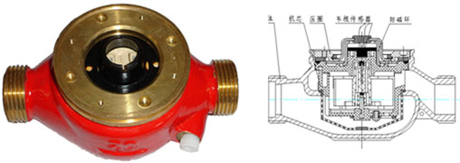 DS97TAR多流束有磁熱量表流量計(jì)的結(jié)構(gòu)如圖,其工作原理是:熱水進(jìn)入流量計(jì),經(jīng)進(jìn)水導(dǎo)向孔沖擊計(jì)量腔內(nèi)的葉輪旋轉(zhuǎn),再經(jīng)出水導(dǎo)向孔流出流量計(jì)。葉輪上面嵌有磁鋼隨葉輪旋轉(zhuǎn),在隔板上端的韋根遠(yuǎn)傳組件,接受葉輪旋轉(zhuǎn)的周期信號(hào)。其殼體采用優(yōu)質(zhì)黃銅,經(jīng)鑄造、數(shù)控機(jī)床和組合機(jī)床加工,機(jī)械強(qiáng)度好、尺寸精度穩(wěn)定一致,塑料零件選用進(jìn)口的高強(qiáng)度耐熱工程塑料,密封件采用優(yōu)質(zhì)耐熱材料。因此,該流量計(jì)完全能夠適應(yīng)國(guó)內(nèi)供熱系統(tǒng)的惡劣工作環(huán)境。