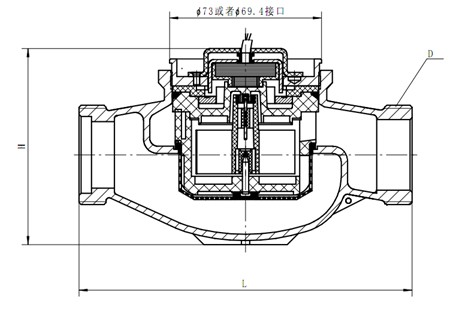 DS97TAR多流束有磁熱量表流量計(jì)的結(jié)構(gòu)如圖,其工作原理是:熱水進(jìn)入流量計(jì),經(jīng)進(jìn)水導(dǎo)向孔沖擊計(jì)量腔內(nèi)的葉輪旋轉(zhuǎn),再經(jīng)出水導(dǎo)向孔流出流量計(jì)。葉輪上面嵌有磁鋼隨葉輪旋轉(zhuǎn),在隔板上端的韋根遠(yuǎn)傳組件,接受葉輪旋轉(zhuǎn)的周期信號(hào)。其殼體采用優(yōu)質(zhì)黃銅,經(jīng)鑄造、數(shù)控機(jī)床和組合機(jī)床加工,機(jī)械強(qiáng)度好、尺寸精度穩(wěn)定一致,塑料零件選用進(jìn)口的高強(qiáng)度耐熱工程塑料,密封件采用優(yōu)質(zhì)耐熱材料。因此,該流量計(jì)完全能夠適應(yīng)國(guó)內(nèi)供熱系統(tǒng)的惡劣工作環(huán)境。