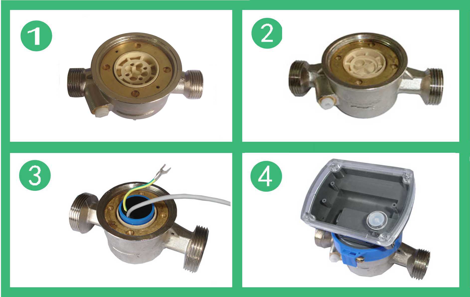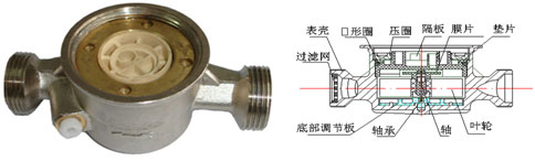 CD02TAR單流束無磁熱量表流量計(jì)的結(jié)構(gòu)如圖,其工作原理是:熱水進(jìn)入流量計(jì),經(jīng)進(jìn)水導(dǎo)向孔沖擊計(jì)量腔內(nèi)的葉輪旋轉(zhuǎn),再經(jīng)出水導(dǎo)向孔流出流量計(jì)。葉輪上面嵌有不銹鋼膜片,隨葉輪旋轉(zhuǎn),在隔板上端接近不銹鋼膜片處可裝電感類傳感器,接受葉輪旋轉(zhuǎn)的周期信號。